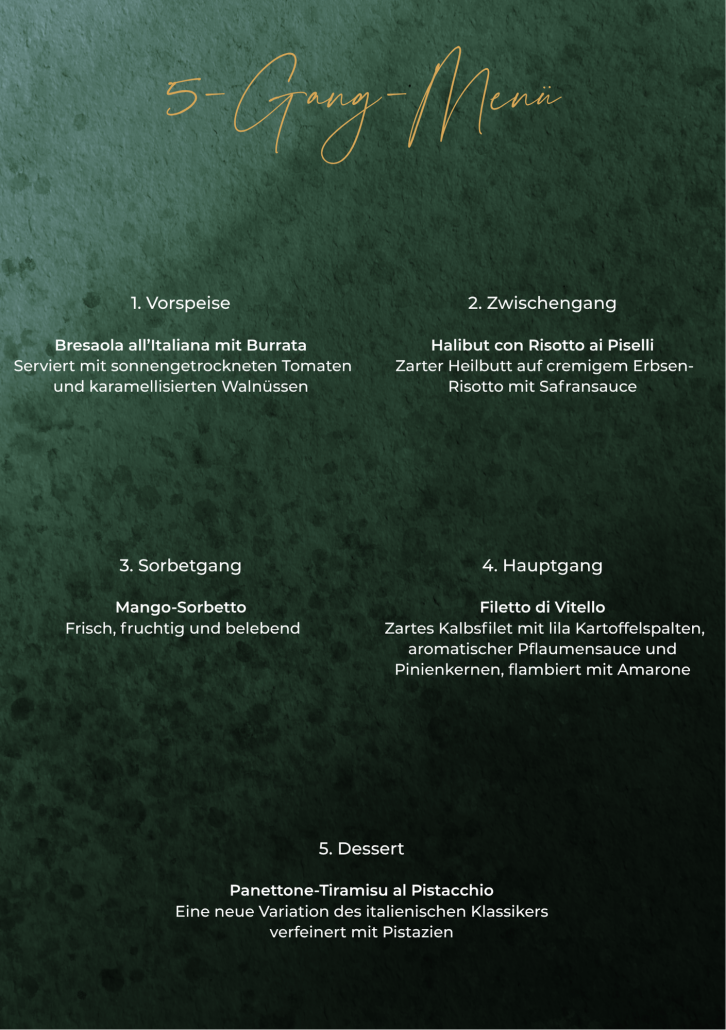 Freuen Sie sich auf unser exklusives 5-Gang-Menü, das mit viel Liebe zum Detail zusammengestellt wurde. Jeder Gang vereint italienische Raffinesse mit feinen saisonalen Aromen – perfekt, um das Jahr genussvoll ausklingen zu lassen.